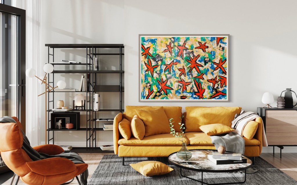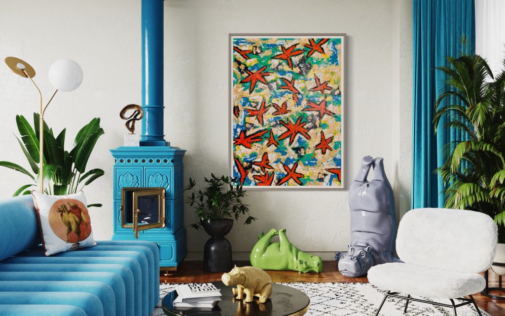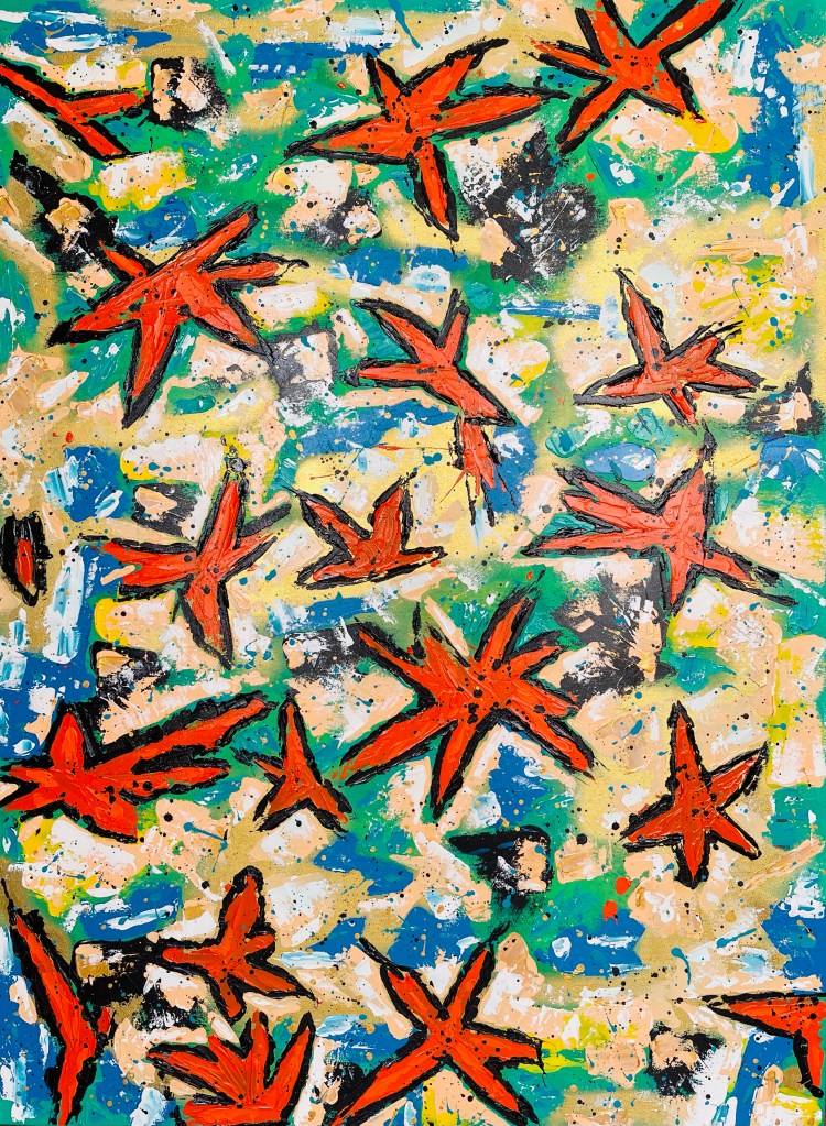 The Starfish Beach is in the north of Phú Quốc, a Vietnamese island located in the Thailand Gulf, in front of the Cambodian coast. And there it is, the Starfish Beach, a paradise that people seem to be stubbornly determined to destroy. I wanted to capture forever the amazing view of the hundreds of starfishes I saw when I dived there the first time back in 2019. There were hundreds of them, massive starfishes in a vivid orange with dark bluish and brown bumps. I tried to capture the essence of the water, in a mix of blue and turquoise that changed constantly and the golden sand.